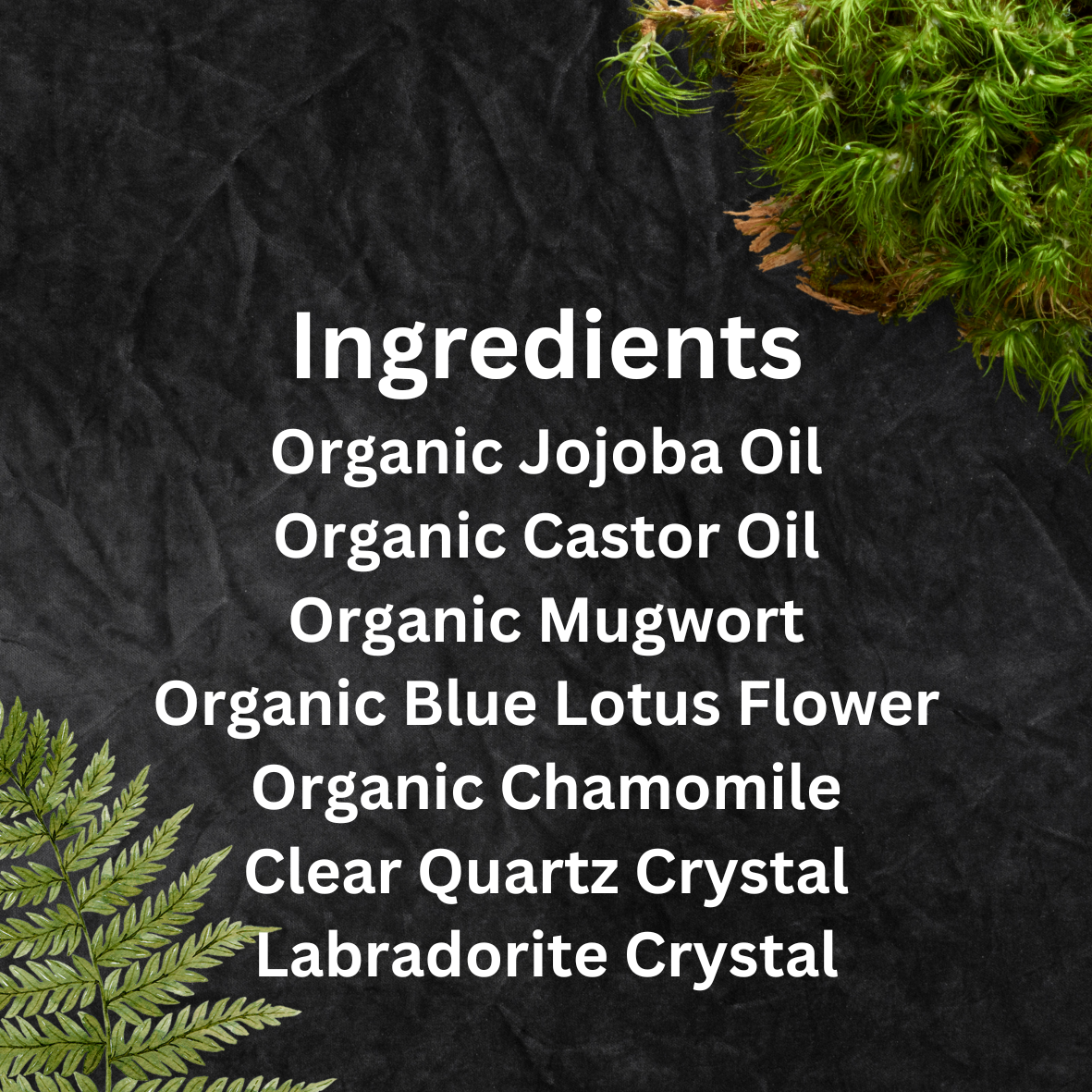 Crafted with a base of organic jojoba and castor oil for smooth absorption and skin nourishment, this elixir carries the mystic trio of blue lotus flower, chamomile, and mugwort—herbs long revered for their connection to clairvoyance, trance, and prophetic dreaming. Embedded within are clear quartz to amplify energy and labradorite to activate the third eye, protect the aura, and invite transformative insight.