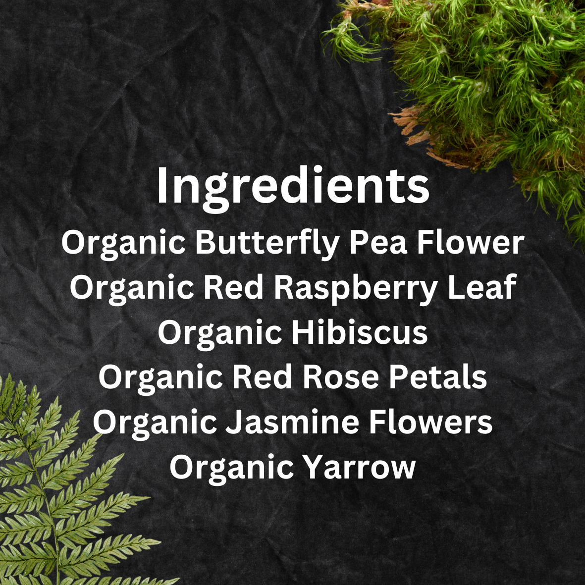 Ingredients: Butterfly pea flower, red rose petals, jasmine flowers, yarrow, red raspberry leaf, hibiscus.