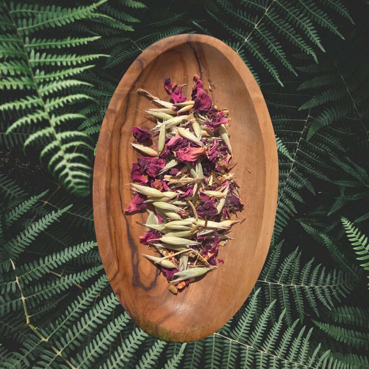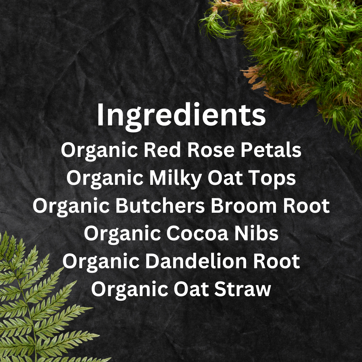 Ingredients: Butcher’s broom root, cocoa nibs, oat straw, milky oat tops, dandelion root, red rose petals.